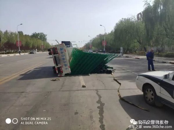 4月17 日下午15 时许,安平交警大队执勤民警在辖区经五路附近巡逻时,发现一辆货车侧翻在马路中间,车上拉载的网片散落一地,占据了一半路面。