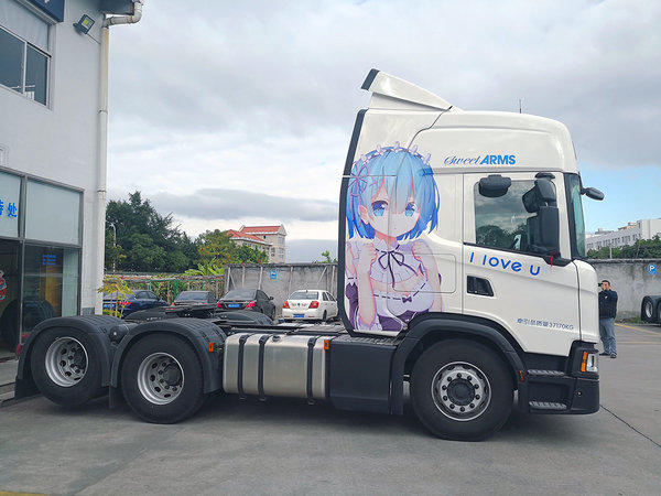 【卡车之家 原创】5月5日,厦门一位卡友在微信群内分享了几张斯堪尼亚牵引车的照片。与众不同的是,这辆车上贴有二次元角色“蕾姆”的图像。据这位卡友介绍,完成这次改装光材料费就要2000元,此外还要加上人工贴图的费用,投入也是不小。