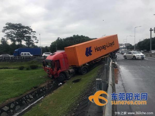 5月9日早上7时30分许,茶山大队接报东部快速公路辅道上发送一起货车冲出护栏交通事故,随即,大队事故处理民警迅速赶到事发现场。民警到达现场后,见一牵挂车车头与隔离护栏碰撞后,车头与大半车身已经冲到路外的绿化带上,所幸车上司机没有受伤。