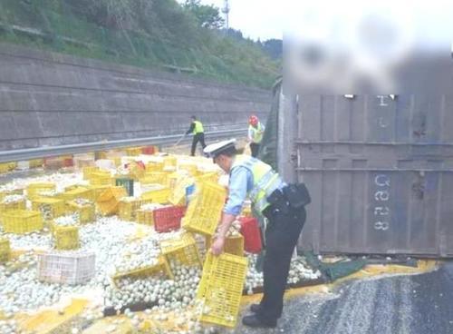 司机没有因为安全带的保护而遭受严重损坏,但脆弱的鸭蛋没有保持全部破碎,看到了8万个鸭蛋破碎的图片,司机的心脏也破了,虽然司机伤心欲绝,但原因仍然存在,金蛋液流动肯定会影响其他车主的通行,所以他很快报了警。接到司机的报警后,相关人员赶到现场,先在路边放置一个标志,提醒路过的司机,然后继续清理鸡蛋液。