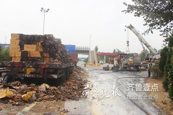 期间,装载鸡蛋的半挂车火势迅速被扑灭,而百货车的火势反复复燃,水灭火剂的效果并不理想。为安全高效做好火灾扑救工作,消防指挥员详细询问了半挂车内是否装载易燃易爆危险化学品,百货半挂车驾驶员对装载的货物并不知情,给指挥决策带来了一定考验。