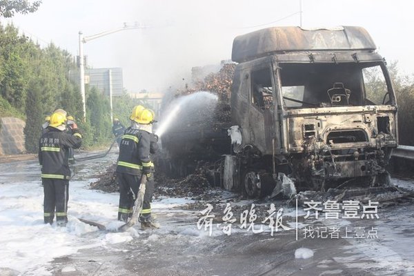 5月24日05时27分,临沂市消防支队临沭县大队指挥中心接到报警电话:长深高速临沭县停车服务区道路西侧,两辆满载货物的半挂车起火,火势较大,请求紧急救援。接到警情后,立即调派郑山中队4辆消防车25名消防指战员赶赴现场救援。