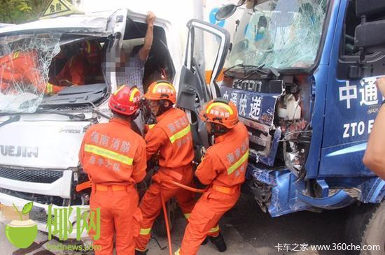 9时47分,消防员到达现场,经勘查和询问得知,事故现场为一辆危险品货车(空车)与一辆中通快递货车相撞,造成危险品货车车头严重变形,驾驶室内司机被困,腿部被卡于方向盘下方,无法移动,意识清醒。