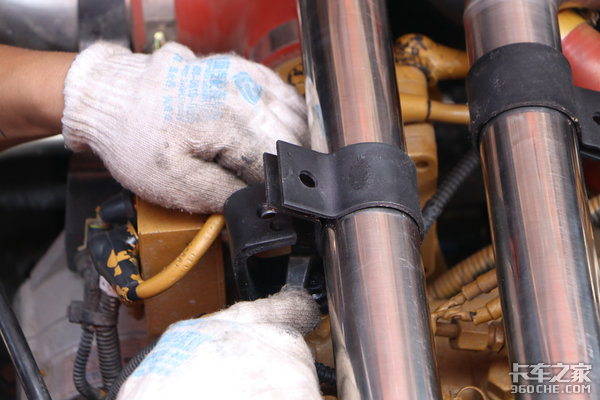 第四步:支架制作。每段不锈钢水管必须有支架支撑。支撑点必须位于:发动机、变速箱、缓速器上,不允许在车架上做支撑点。同时,水管不能与车架有直接干涉。