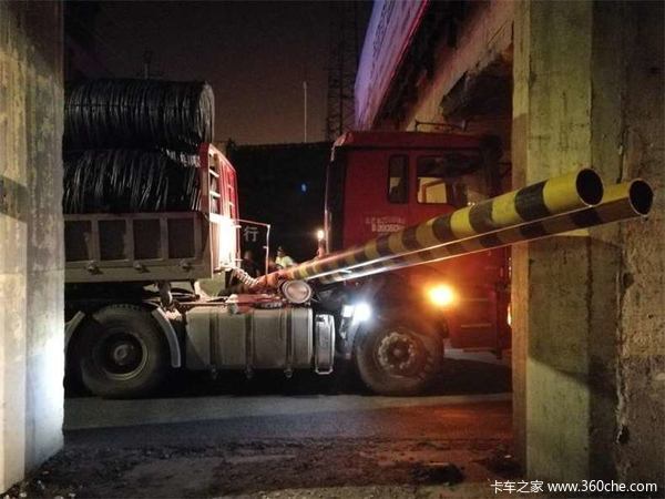 凌晨0点多,二环支路京广铁路涵洞西侧,一辆拉钢筋的半挂货车与涵洞外的限高架发生碰撞,限高架卡在车头与车身之间,使得货车在涵洞口处进退不得,行经此处的部分车辆不得不逆行通过。