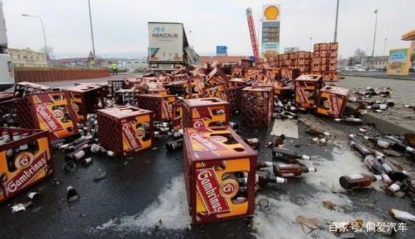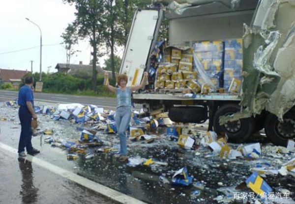 图中这台卡车,就是北欧的捷克一条道路上的卡车侧翻事故,里面装的是300箱的啤酒,整个洒落在坚硬的道路上,隔着老远就能闻着啤酒的香气四溢。