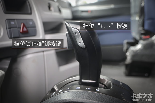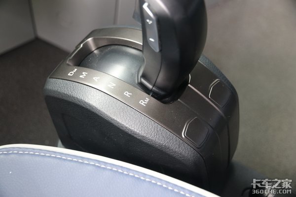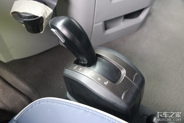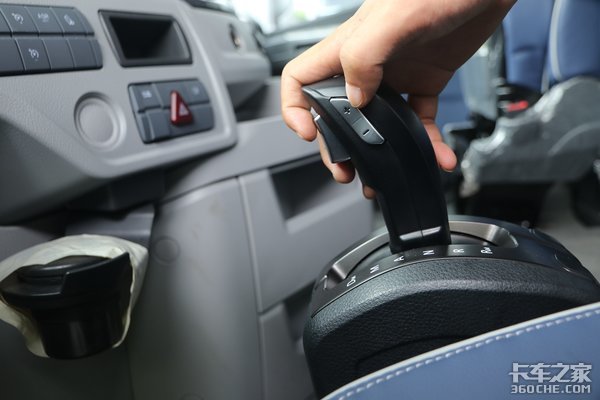 在驾驶室内,我们可以看到这款车的挡杆非常趋进于乘用车的设计风格,与常见粗壮的挡杆相比,自动挡的操作杆果然苗条了不少。档位分布上,相比繁杂的16挡来说,自动挡基本不需要你来思考,挂什么挡,交给电脑就好。