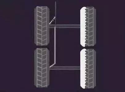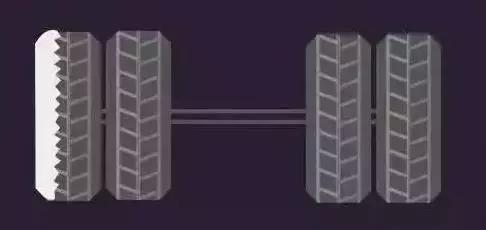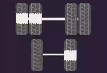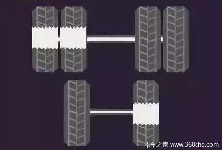 吃胎现象:双前桥车辆转向桥上一桥轮胎内侧、一桥轮胎外侧不正常磨损。