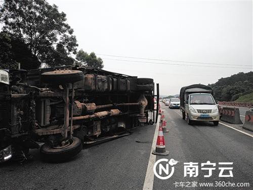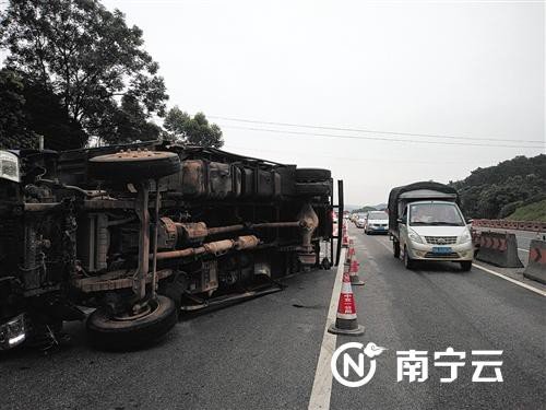 凌晨5时左右,广西高速公路管理支队七大队执勤民警接警后,立即赶到事故现场,看到一辆侧翻的桂A货车已被移至路边,货车车头玻璃破裂,右后两个轮胎已经掉了出来,所幸车上装载的货物没有撒落出来。