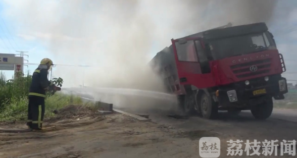 几分钟后,金坛区南环路消防救援中队赶到了现场并展开灭火工作,此时货车由于右后侧轮胎燃烧严重已经出现了车体倾斜,火势正往货车油箱所处位置蔓延,消防员立即出动两只水枪,一只灭火,一只降温,大约十分钟后,彻底将火势扑灭。