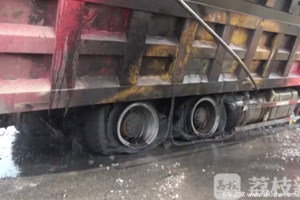 从扑救后的燃烧现场来看,可以初步判断火势的确是从右后侧轮胎处开始燃烧,之后逐步蔓延。而货车驾驶员表示,当天行驶时间并不长,但右后侧的几只轮胎确实已经使用了一段时间,可能抗热性下降,加上酷暑路面高温,引发了燃烧。