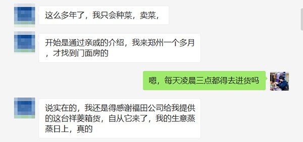 从深夜到天亮再到黑夜,总有人努力为生活打拼着,刘享贤就是其中的一员。为了能进到新鲜蔬菜水果,开着福田祥菱起早摸黑、风里雨里每天到十几公里外的市场,两天一次再到中牟万邦。