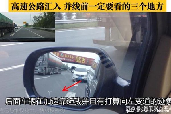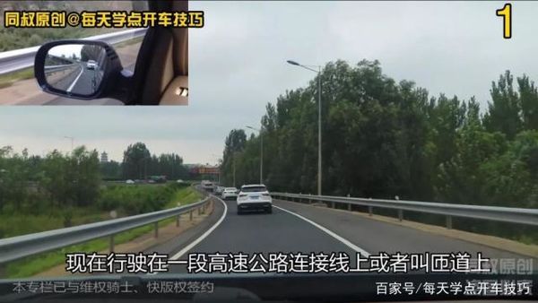第二、车辆在提速车道顺直时,通过左侧后视镜观察左后方有无车辆正在接近,并根据在后视镜中的图像大小变化来判断它接近的速度。