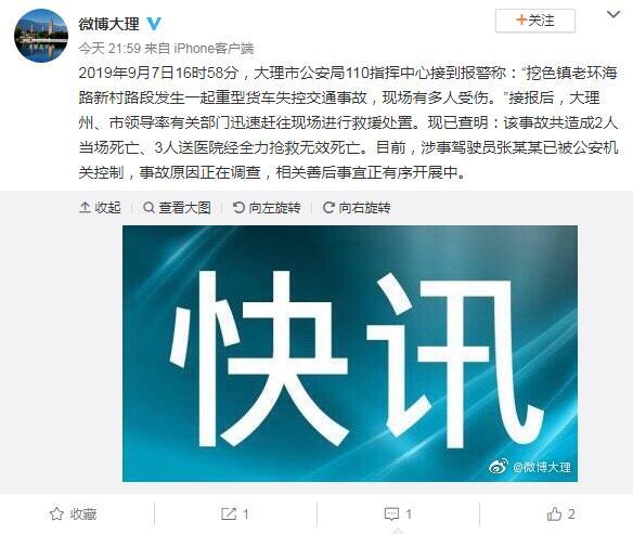 通报称,2019年9月7日16时58分,大理市公安局110指挥中心接到报警称:“挖色镇老环海路新村路段发生一起重型货车失控交通事故,现场有多人受伤。”