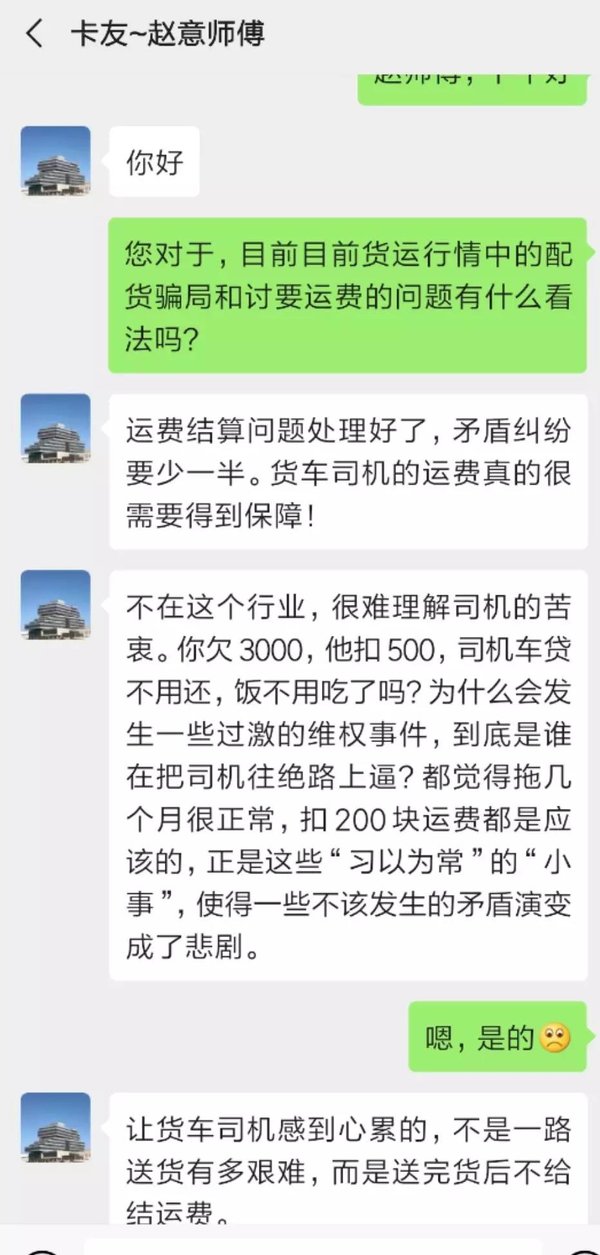 卡友孙军的心声:几年前吧!那个时候自己有个前四后八,因为着急回家,就在重庆配了一车货到西安,说好的货到付款,结果货到了款没付,说先走吧!等统一打款,就没消息了,中间打过几次电话,说得好听给你打款了啊!