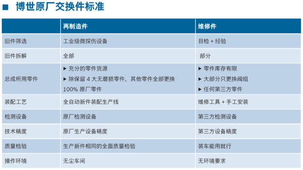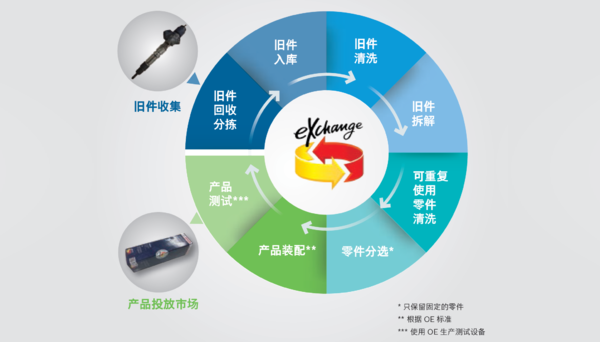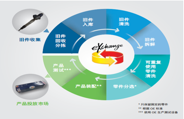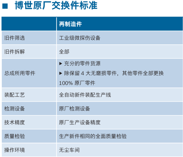 可能有相当多的人都认为再制造就是把旧件翻新,产品质量肯定不如新品,其实并不然。根据欧洲汽车供应商联合会的定义,再制造产品的生产,使用标准化工业生产过程,并且该过程要符合特定的技术规范,包含用于生产旧件管理标准。在性能上,再制造产品必须与同型新品达到一致的性能,并且提供与新件同样的质保。博世再制造产品称之为博世原厂交换件,是Bosch eXchange的缩写,简称BX。