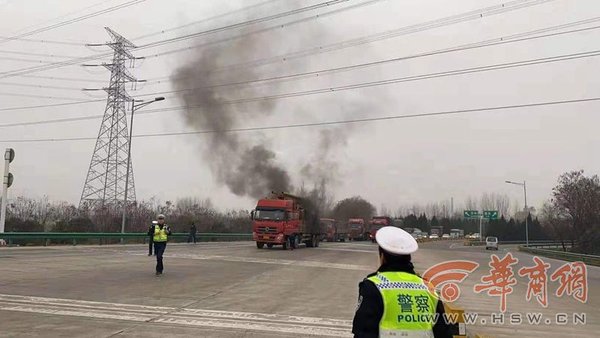 1月6日下午,西安交警高速大队西汉中队民警带领值班人员在完成鄠邑收费站整治任务后巡查途中,发现距收费站下站口200米位置一辆四轴货车后轮着火,浓烟滚滚。