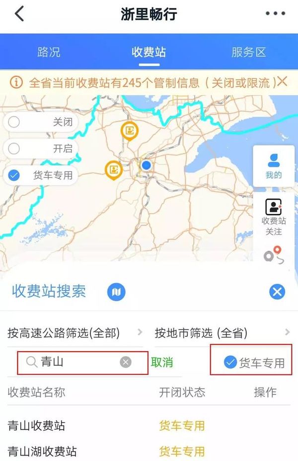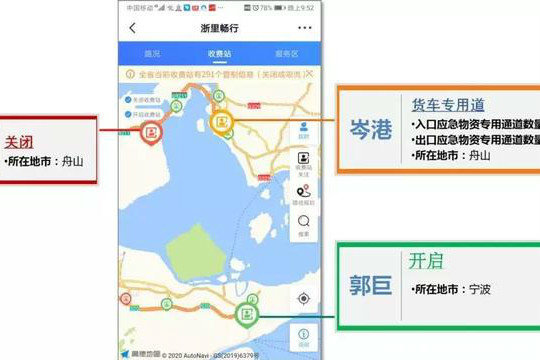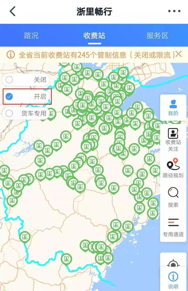 针对货车司机们关心的货车专用车道和专用收费站点位地图展示,浙里畅行再度升级,已在收费站开闭模块中加入新功能,具体操作: