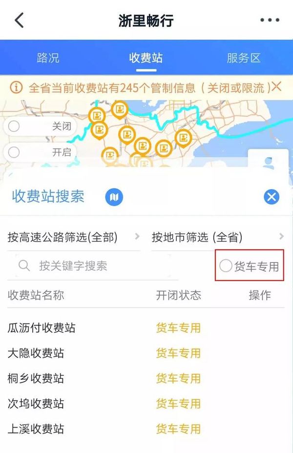 近日,为优先保障应急物资运输,浙江省交通运输厅和省公安厅联合下文,要求各地积极开通专门用于货车通行的高速公路收费站。浙里畅行第一时间上线新功能,面向货车司机提供浙江省高速公路收费站货车专用通道开放情况查询功能。