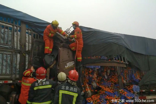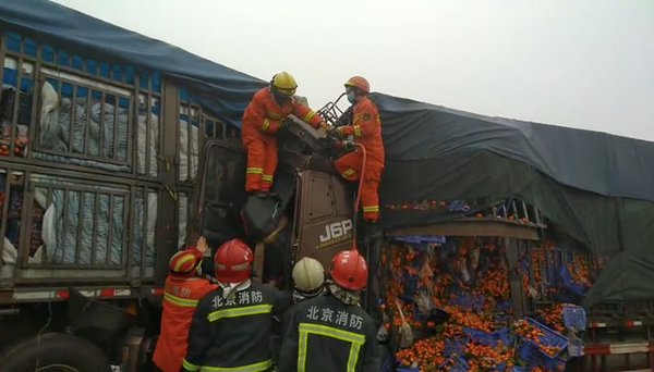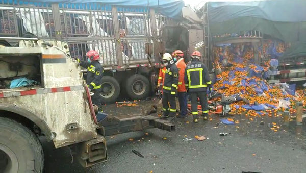 消防指战员到达现场后看到,现场为三辆大货车发生连环追尾,三辆货车驾驶室均损毁严重,中间货车拉了一车的橘子,散落一地,驾驶室有两名男子被困。