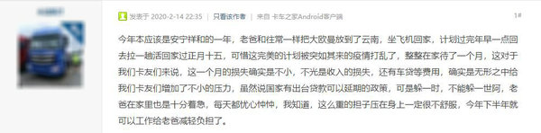 【卡车之家 原创】疫情爆发后,各行各业都受到了不同程度的影响。对我们卡友而言,工厂、物流园等延期复工,将会影响许多人的生活质量,甚至无力偿还购车贷款。