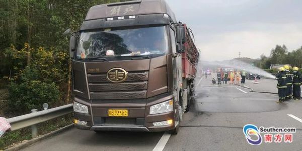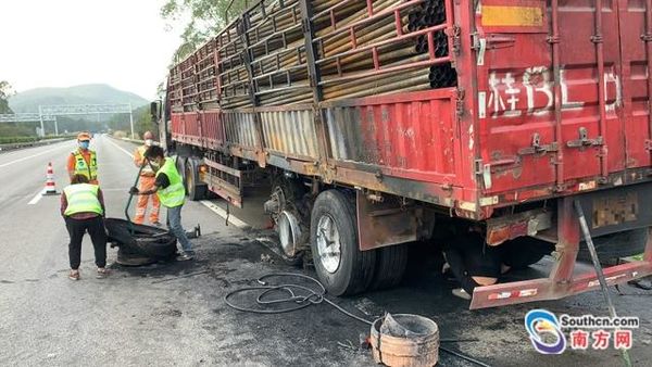 15时24分,救援人员再次确认安全后离开现场,而因后轮胎烧毁,车辆无法拖拽及行驶,路政人员联系粤运拯救单位,现场更换了货车轮胎。