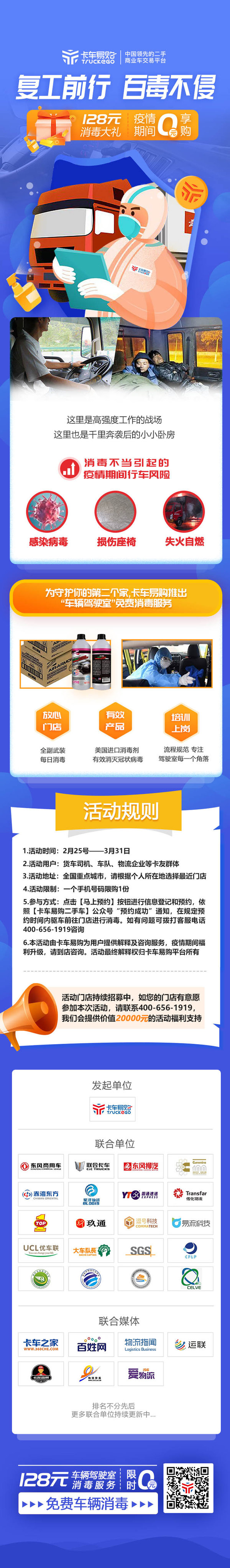 截止至今日,卡车易购已联合了近30家单位及媒体共同参与本次公益活动,线下服务网点500+。更多联合单位和线下服务网点也在不断更新中!如您的门店或单位有意向参与本次公益活动,卡车易购会为所有合作伙伴提供20000元福利支持。具体信息可详询400-656-1919。(400电话为唯一联系方式,公益活动不收取任何费用!)