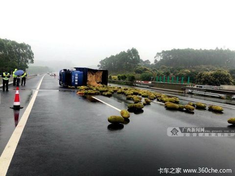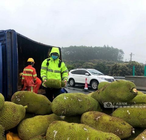 据了解,货车拉载了5.5吨的木菠萝,从海口运往南宁。12时许,撒落在路面的木菠萝才被清理干净,随后,施救车辆将侧翻的货车吊起,并拖离高速公路。