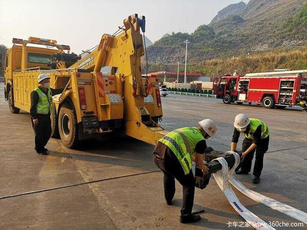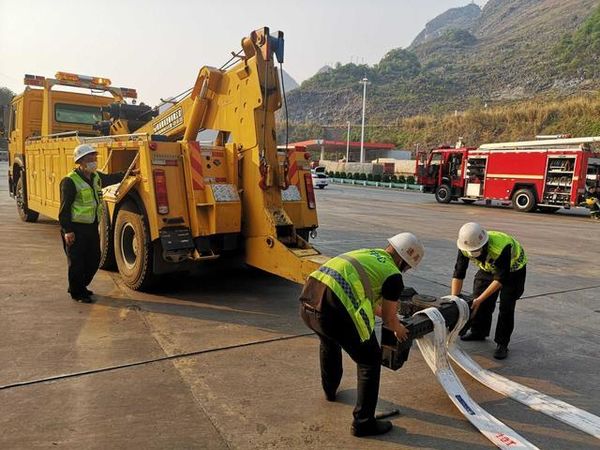 随后,安龙县政府应急办、安龙应急保畅中队、安龙高速交警、安龙路政大队、黔西南中石化分公司、消防队员立即在现场成立临时处置小组。经研讨决定,多方果断采取措施,使用100吨吊车把货车吊起,由安龙应急保畅中队拖车进行牵引,把货箱与车头进行分离,分别拖至安全地带。在调运的过程中,消防队员全程喷洒泡沫,防止吊运过程中产生的火花导致燃油起火发生爆炸。