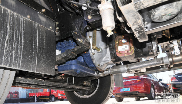 这款车型使用180车架平台,车架截面尺寸为180*65*5mm,后桥为130冲焊桥,速比为5.125,板簧采用前7片后7+3片设计,匹配7.00R16轮胎,油箱为70L塑胶油箱,还标配了断气刹配置。