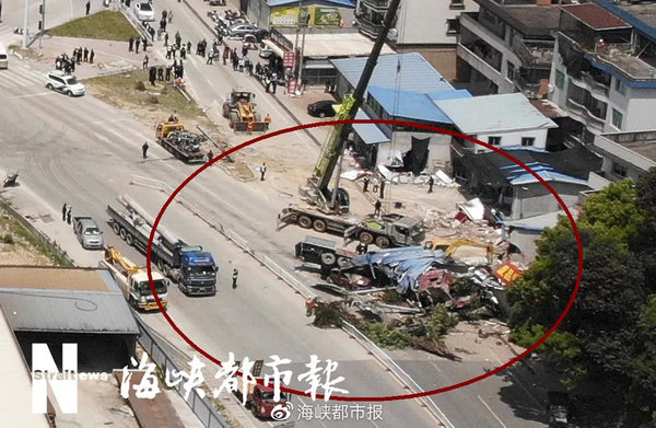据悉,事故车辆是一部福建牌照的重型半挂牵引车,发生事故时正运载水泥管桩,处于连续下坡路段。初步判断是由于车辆失控,该半挂车脱离了主车道,一头撞上了路边的两间民房,导致包括货车司机在内的多人死亡。