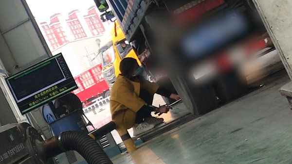 在环保检测车间内,笔者发现车间内工作人员都穿有黄色的反光背心,唯独一位蹲在地上操作环保检测设备的女人没有黄色的反光背心。通过观察,在进行检测时,该女子将环保检测设备的探针通过一个金属棒放在车辆的排气管的尾部,并没有按照要求将探针深入到排气管内部,并在检测员加大油门时,将探针离开排气管。