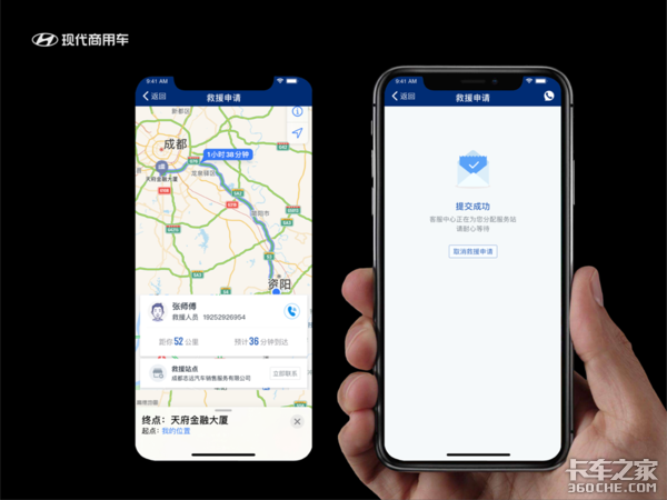 当车辆故障抛锚,需要道路救援生时,卡友只需发送“一键救援”信号,现代商用车会立即收到该需求,并根据实时定位,安排就近服务站与卡友建立联系。为卡友提供及时、快捷的服务,且做出迅速、有效的回应和行动。