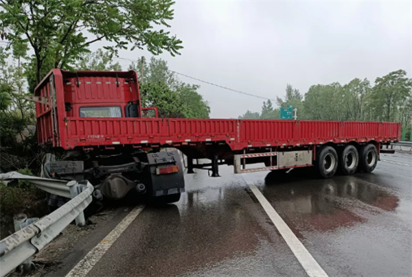 ▎雨天猛打一把方向,半挂车“骑上”高速护栏