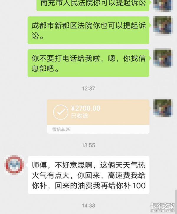 正如卡友发来的聊天记录所示,在离开不久之后,货主发来消息称“最近天气炎热,加上其他事情影响了心情,实属不好意思。”。并且,在后续的聊天记录中,证实货主承担卡车中途离开的油费100元以及150元的高速过路费。