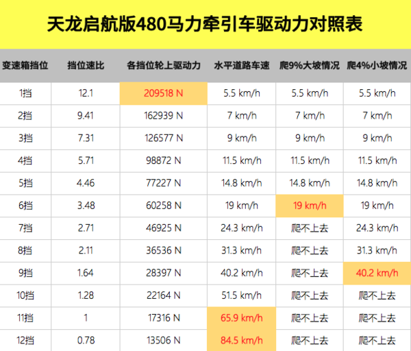 根据扭矩分布图可得,这台天龙启航版在满载状态下,爬小坡需要提前将挡位降低至9挡,在爬大坡时,则需要将挡位提前降低至6挡。并且,这个挡位只能更低,不能更高,不然一旦在坡上熄火,再次重车起步可是一件非常麻烦的事情。所以,对于车辆性能不怎么熟悉的卡友来说,建议你先点击《卡车之家专业版车速计算器》仔细了解自己车辆的扭矩分布信息,并且在爬坡之前,提前将挡位切换好,确保有充分的动力爬坡。