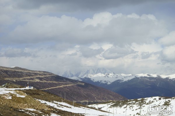这一路的车流量较小,路况也较不错,我们的凯运蓝鲸在雪山映衬下也气势十足。