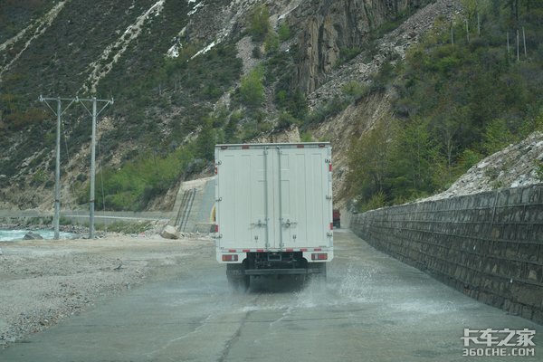 高原山区的山顶都有不少的积雪,白天温度稍高一些,山地的积雪融化后便会顺流而下,在山路上形成一段段低洼的水流,凯运蓝鲸配备的7.50R16真空胎,较为宽大的轮胎接地面能够保证更多的抓地力,更湿滑的路面也能保证较好的稳定性。