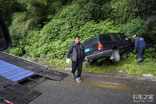 下山途中,一辆旅行版的普桑冲出了路,滑到了路边的草丛里,拖车正在努力的把这“小可怜”给拽出来。