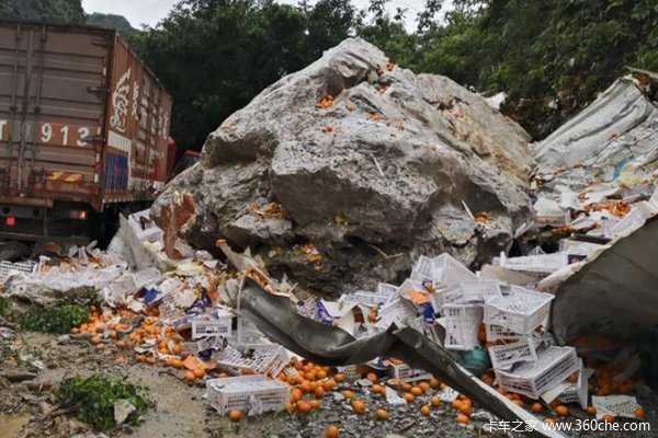 笔者在现场看到,数块巨石砸在路边上,将路面砸出了不少坑,还有一些碎石将道路中的护栏砸翻,其中一块近5米宽的巨石正好砸在2辆并排而行的大货车中间,将一辆大货车车头完全砸毁,另一辆大货车的车厢也被砸中,车内的橙子散落一地。所幸的是两辆货车的司机只是受些轻伤,已被送往医院接受治疗。