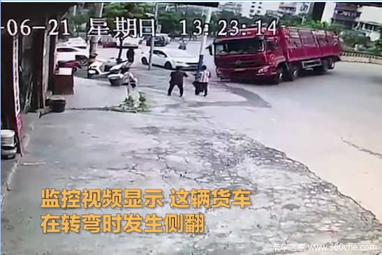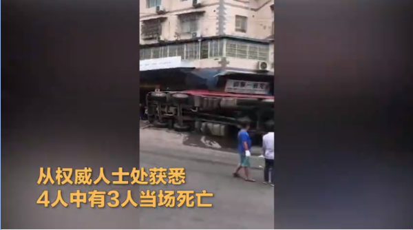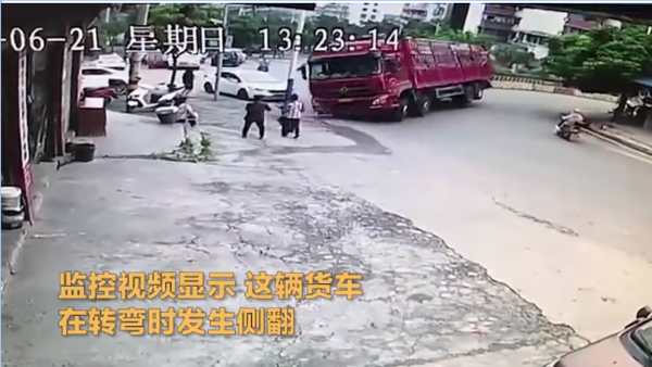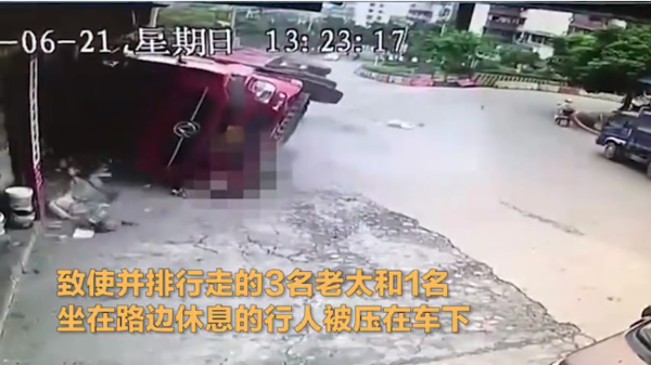 6月21日下午,一辆悬挂河北牌照的重型货车在重庆市江津区发生侧翻。根据现场监控视频显示,这辆货车在转弯时发生侧翻,致使并排行走的3名老太和1名坐在路边休息的行人被压在车下。据悉,事故发生后,4人中有3人当场死亡,1人送医抢救无效后死亡。