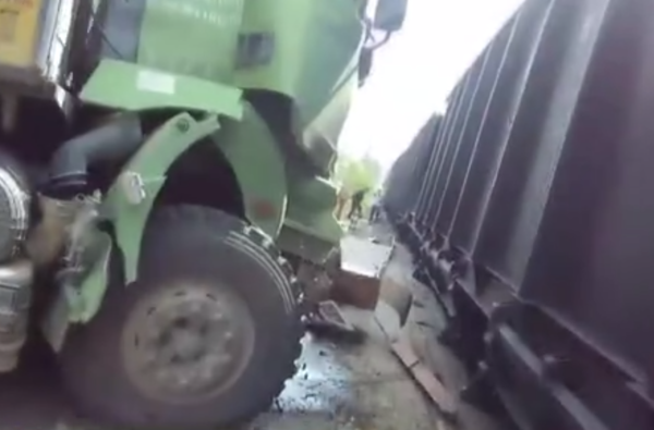 【卡车之家 原创】一辆重型自卸货车与火车相撞,场面一度十分惊险!