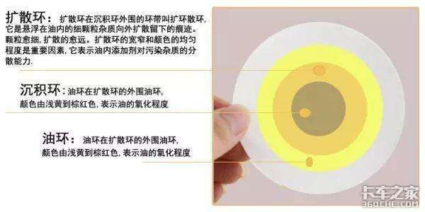 1,机油试纸:通过机油尺中取出少量机油滴在机油试纸上,然后静止放置一个晚上,等待上面的机油在试纸上完全扩散。如果扩散的机油油环、沉淀环、扩散环之间的边缘越硬,则机油性能衰减就越厉害。机油试纸购买的途径很方便,同时价格也不高,小编建议各位卡友人手一份以备随时检查机油状态。