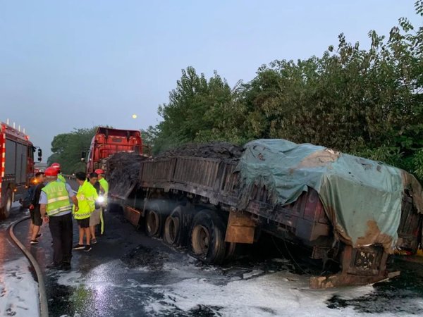 接到报警后,消防救援人员火速抵达现场,利用两个小时才将明火全部扑灭。为了防治复燃,消防救援人员又利用水枪对车轮及附近进行降温扫射,在仔细排查确认再无安全隐患后才撤离现场。