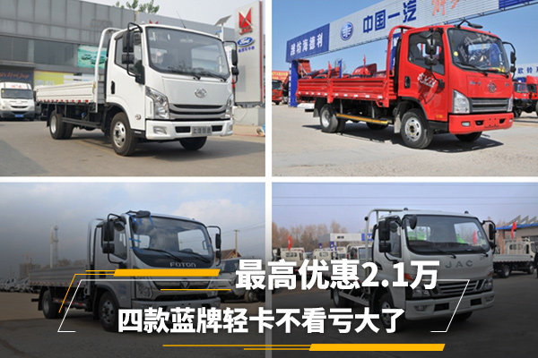 【卡车之家 原创】对于蓝牌轻卡的好处,我想各位卡友都有所了解。尽管受“大吨小标”事件影响,但合规轻卡仅就路权这一优势就是其他车型所比不了的。据了解,近期有不少地区的经销商正在对轻卡进行降价促销,小编搜集了四款轻卡车型,分别是江淮骏铃V6、福田奥铃速运、上汽跃进 超运C300-33、解放虎VN。
