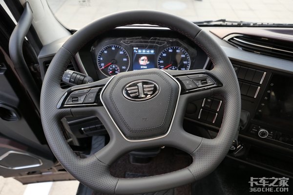 方向盘算是大变样,虽然还是四幅式,但不得不说新方向盘看着就是上档次,其手感及质感直追斯堪尼亚。方向盘整体不再是一个圆形,下面的弧度改为偏直线一些,这样的好处就是,有“将军肚”的卡友如果贴着坐,方向盘不会那么的顶着肚子。