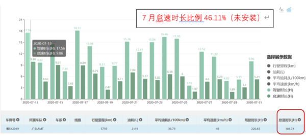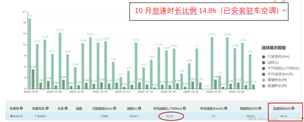 但是观察了2个月的后台油耗数据,立刻不淡定了,怠速时常几乎占据了驾驶时长一半的比例,7月13-8月30,怠速142小时,就算消耗400L柴油,按照单价5元/升计算,两月不到(7月13日开始统计,8月又几乎没出车,加一起也就一个月时间)怠速吹空调用了2000块,这哪受的了!