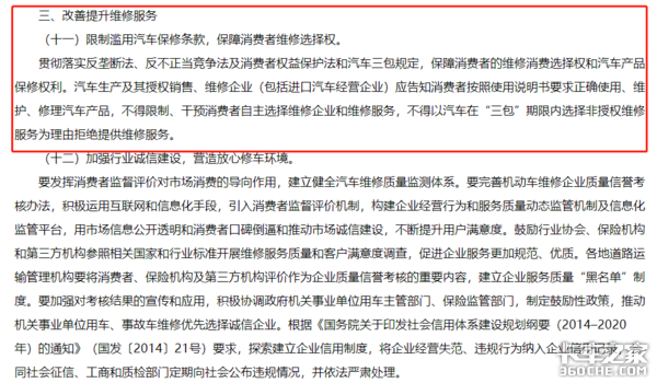 根据交通运输部等部门联合发布的《关于促进汽车维修业转型升级提升服务质量的指导意见》中第十一条中所讲的,汽车生产、授权销售、维修企业部的限制、敢于消费者自主选择维修企业和维修服务。不得以汽车在“三包”期限内选择非授权维修服务为理由拒绝提供产品维修服务。