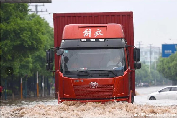 此外,在强降雨天气下,卡友们行车不免会经过涉水路段。在此劝解卡友们,在情况不明的情况下,切勿盲目自信的轻易驶过涉水路段。虽然卡车底盘高、驾驶室高大,但这并不意味着车辆拥有出色的涉水性能。