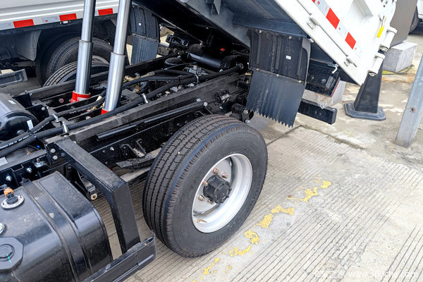 实拍车辆的前轮规格为6.00R15LT,后桥已经变为单后胎设计,其尺寸规格为245/70R17.5。这种前小后大的轮胎配置在很早之前的工信部产品公示里就有出现过,这样设计的好处在满足车辆更大承载力的同时,还兼顾到了法规对蓝牌自卸轮胎总负荷的要求,也是新规下后单胎自卸的主流配置。
